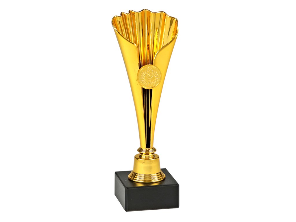 Plastový pohár zlatej farby s miestom pre mini emblém, čierny mramorový podstavec