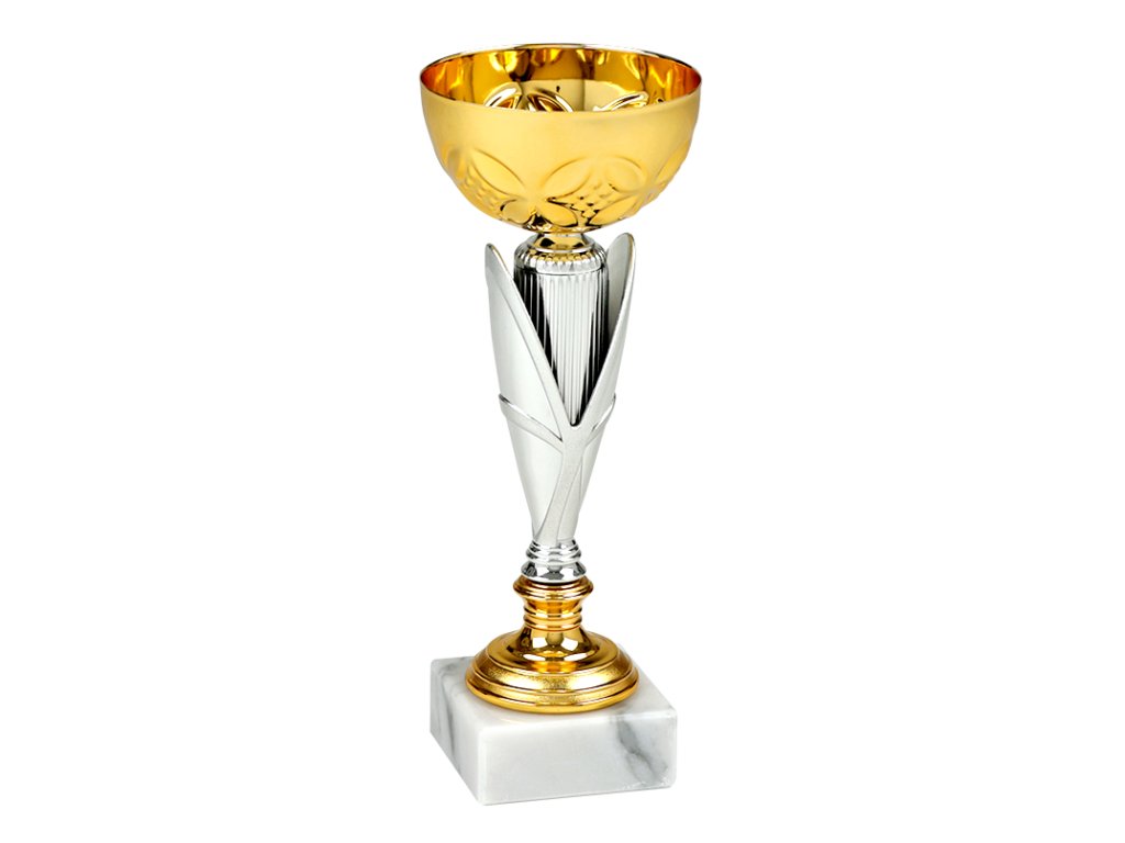 Pohár strieborno-zlatej farby, kovový kalich, strieborná plastová nožička, biely mramorový podstavec