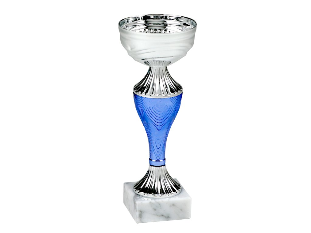 Pohár striebornej farby, kovový kalich, plastová modrá nožička, biely mramorový podstavec